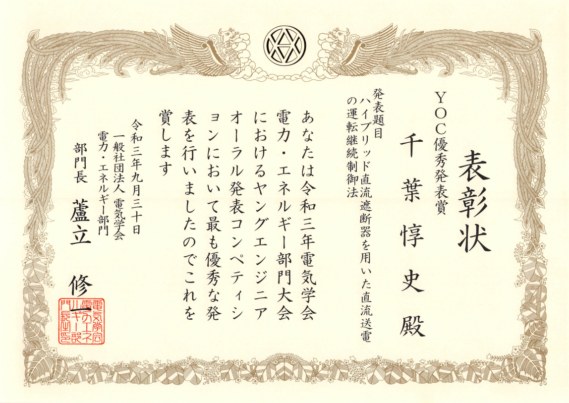 当研究室の千葉惇史さん(修士課程1年)が, 電気学会 電力・エネルギー部門大会YOC(Young engineer Oral presentation Competition) 優秀発表賞を受賞しました。受賞論文の題目は「ハイブリッド直流遮断器を用いた直流送電の運転継続制御法」です。