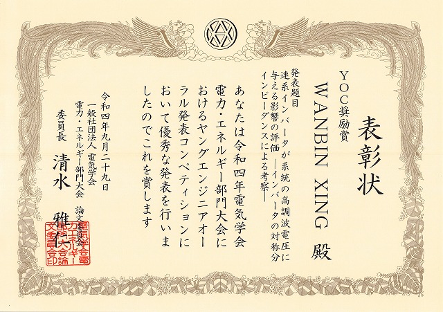 2022年9月電気学会 電力・エネルギー部門大会YOC奨励賞を受賞しました