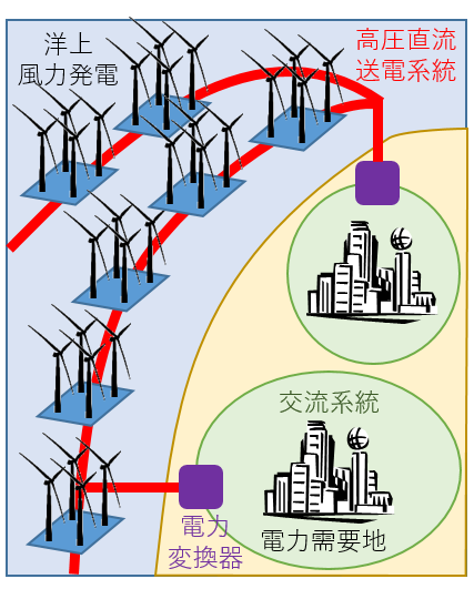 パワーエレクトロニクスの応用分野の1つに,高圧直流送電があります。海底ケーブルによる大容量の送電線では,技術的制約や経済性から,従来より高圧直流送電が用いられています。近年,海洋上に大規模な風力発電所が建設されるようになり,これらを海底ケーブルで結んだ海底の送電系統が構築されつつあります。しかし,現状の高圧直流送電では,交流系統のように大規模な電力系統を構築し,安定して運用する方法が確立されていません。