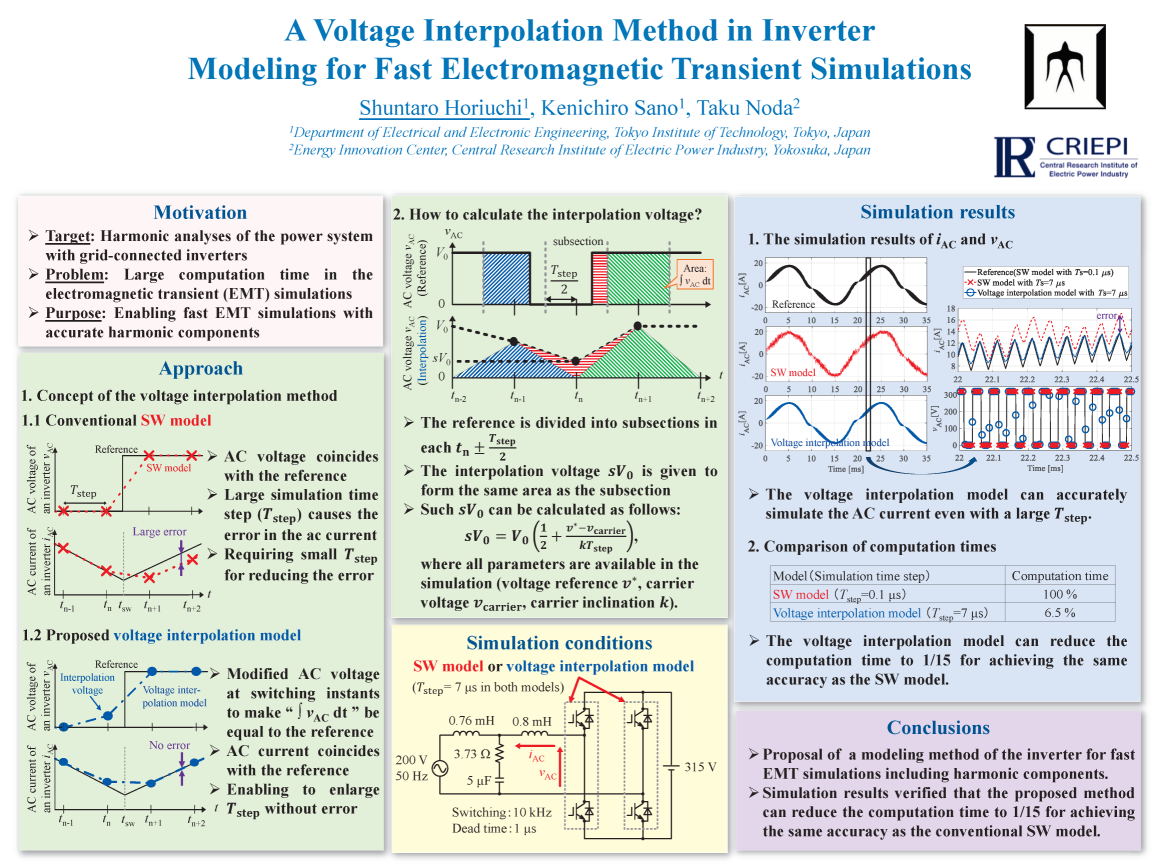 S. Horiuchi, K. Sano, T. Noda, “An inverter model simulating accurate harmonics with low computational burden for electromagnetic transient simulations," IEEE Transactions on Power Electronics, vol. 36, no. 5, pp. 5389-5397, May 2021.